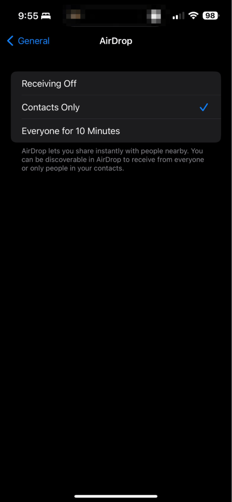 確保至少僅針對聯繫人啟用 AirDrop。由於您是向自己進行空投,因此不需要打開“所有人”。