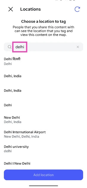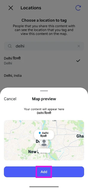 啟動 Instagram,前往DM>您的備註,點擊圖釘圖標,轉到添加位置,選擇一個位置,然後點擊“添加”。