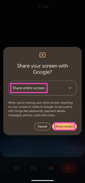 在手機上啟動 Gemini 應用程序,點擊波形圖標,點擊帶有方框和箭頭的圖標,選擇是要共享應用程序還是整個屏幕,然後點擊“共享屏幕”。您還可以長按側邊按鈕觸發 Gemini,然後點擊“與 Live 共享屏幕”或直接向 Gemini 詢問有關屏幕的任何問題。