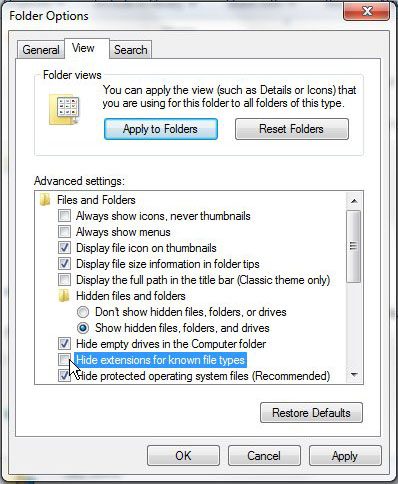 - 刪除旁邊的複選標記隱藏已知文件類型的擴展名。