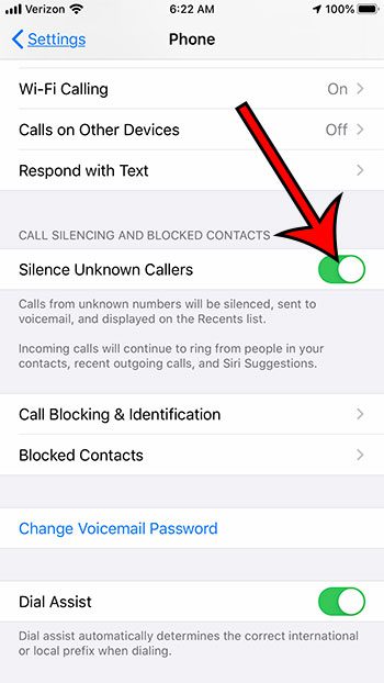 - 向下滾動並點擊“靜音未知來電者”右側的按鈕。