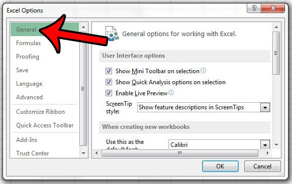 第 4 步:單擊一般的左側列頂部的選項卡Excel 選項窗戶。