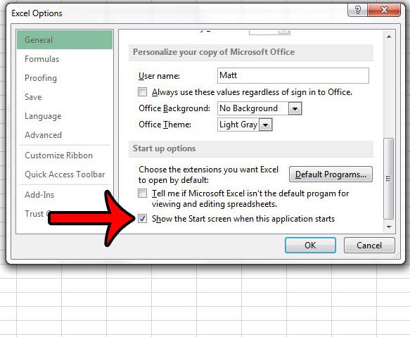 步驟 5:滾動到此菜單的底部,然後單擊左側的框此應用程序啟動時顯示“開始”屏幕刪除複選標記。然後您可以單擊好的單擊窗口底部的按鈕保存更改並關閉 Excel 選項窗口。