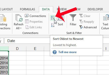 第 4 步:單擊從最舊到最新排序按鈕在排序和過濾導航功能區的部分將最舊的日期放在列的頂部,或者單擊從新到舊排序將最近的日期放在列的頂部。