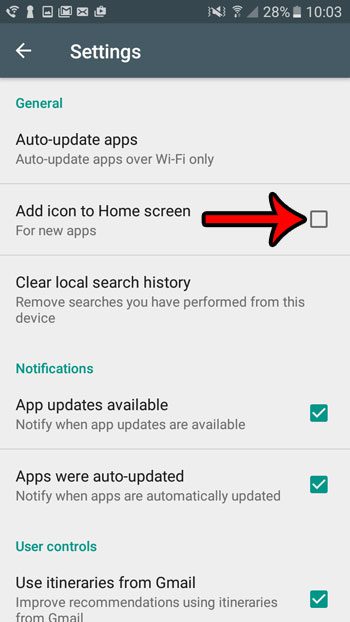 第四步:點擊左側的方框將圖標添加到主屏幕從框中刪除複選標記。我已在下圖中禁用了此選項,因此下次我從 Play 商店安裝應用程序時,該應用程序圖標不會自動添加到主屏幕。