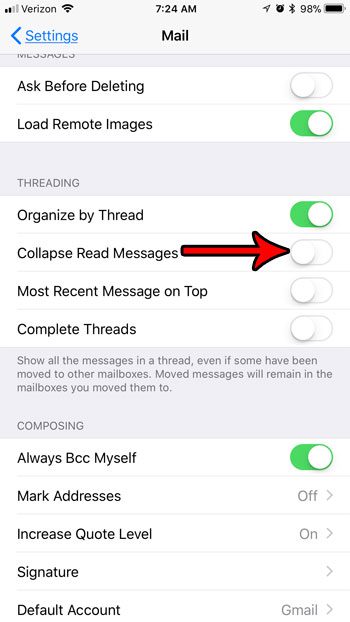 iPhone 上的郵件應用程序中有一些設置會影響這些電子郵件線程,其中一項設置會導致您在查看線程時已閱讀的電子郵件折疊起來。
