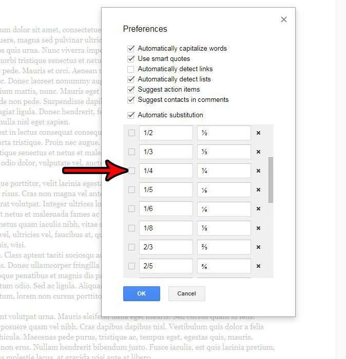 還有一些一開始不可見,因此您需要向下滾動才能看到所有內容。或者,您可以清除左側的框自動替換如果您希望 Google 文檔停止替換您鍵入的任何內容。完成後,點擊藍色好的按鈕位於窗口底部。