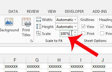 第三步:點擊裡面的規模領域中的縮放以適應窗口頂部導航功能區的部分,然後將該字段中的值更改為100%。如果需要,您也可以將其更改為其他尺寸,但 100% 將以默認尺寸打印。然後,您可以按鍵盤上的 Enter 鍵,或者只需單擊電子表格的其他部分即可應用更改。