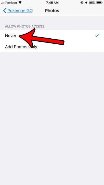 本文中的步驟是在運行 iOS 12.1.4 的 iPhone 7 Plus 上執行的。請注意,禁用此設置不會阻止您捕獲 Smeargle。如果您想將其中一張照片發送給某人,您仍然可以在拍照後使用應用程序中的共享功能。但是,您拍攝的所有照片都不會被保存,並且退出照片查看屏幕後您將無法共享它們。如果您這樣做是為了節省設備空間,那麼學習如何刪除 iPhone 7 上的應用程序可以為您提供另一種節省存儲空間的方法。