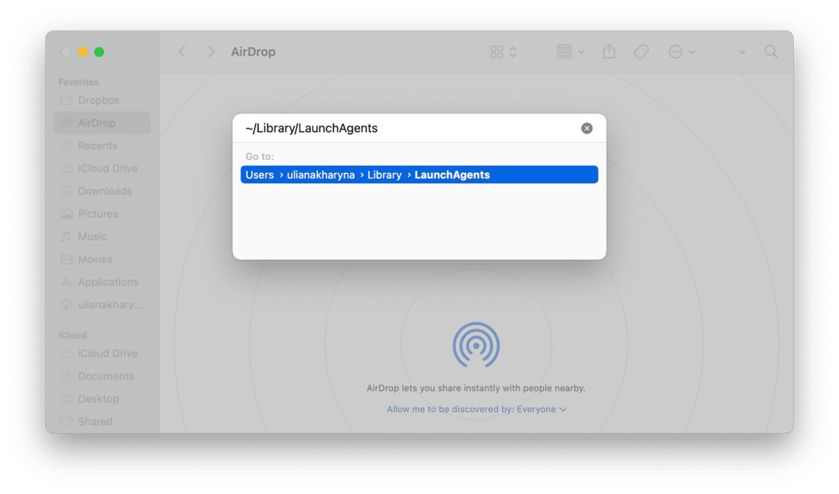 ~/Library/LaunchAgents並按回車鍵。 - 在該文件夾中,查找包含您要停止其後台項目的應用程序名稱的文件。找到後,將文件拖到廢紙簍中。