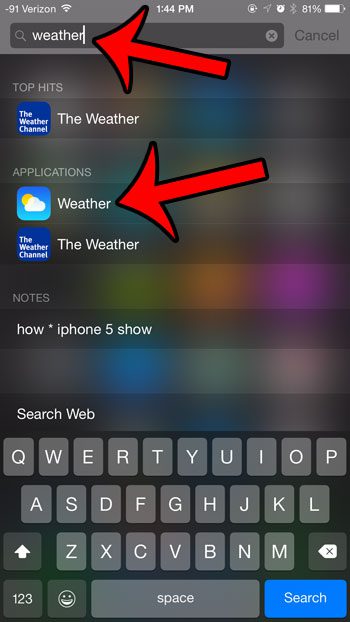 如果它沒有直接顯示在主屏幕上,則它可能位於文件夾中。如果您在文件夾中找不到它,您可以隨時從屏幕頂部向下滑動以打開 Spotlight 搜索,然後輸入天氣進入搜索字段,然後打開天氣應用程式.