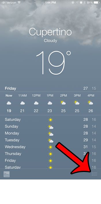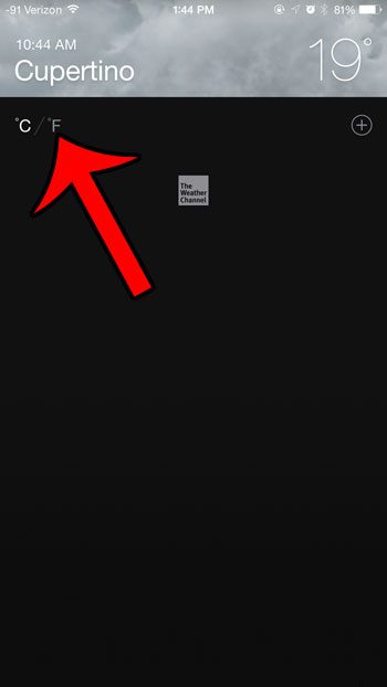 第 3 步:選擇F屏幕左上角的選項。以白色突出顯示的字母是天氣應用程序當前使用的單位格式。