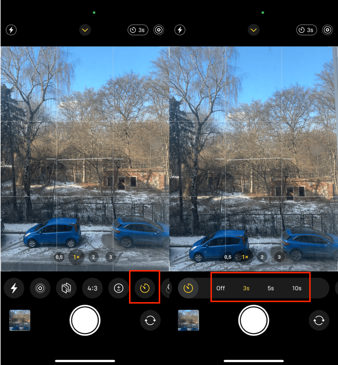- 將自拍(時鐘形圖標)設置為 3-10 秒。使用自拍進行長時間曝光拍攝可以減少相機抖動。