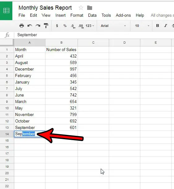 本文中的步驟將阻止 Google 表格在您輸入數據時為您提供自動完成選項。我們指的是當您開始輸入工作表中已有的單詞時出現的以藍色突出顯示的文本。例如,在下圖中,當我鍵入單詞“September”的前幾個字母時,表格會為我提供該單詞的自動完成選項。