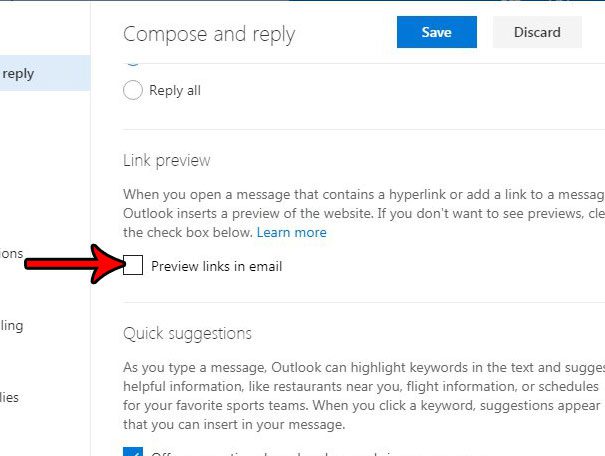 第 5 步:滾動到菜單底部,然後單擊左側的框預覽電子郵件中的鏈接根據鏈接預覽菜單部分。然後您可以單擊節省單擊菜單右上角以應用更改。