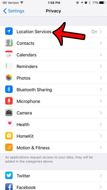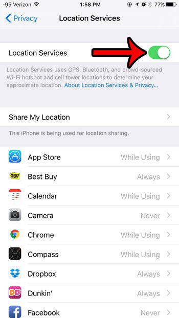 當按鈕周圍出現綠色陰影時,iPhone 6 的定位服務已打開。請注意,您可以通過從此屏幕上的列表中選擇一個應用程序,然後調整該菜單上的設置來調整各個應用程序的定位服務設置。