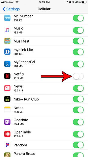 第三步:向下滾動並點擊右側的按鈕Netflix關閉應用程序的蜂窩數據。