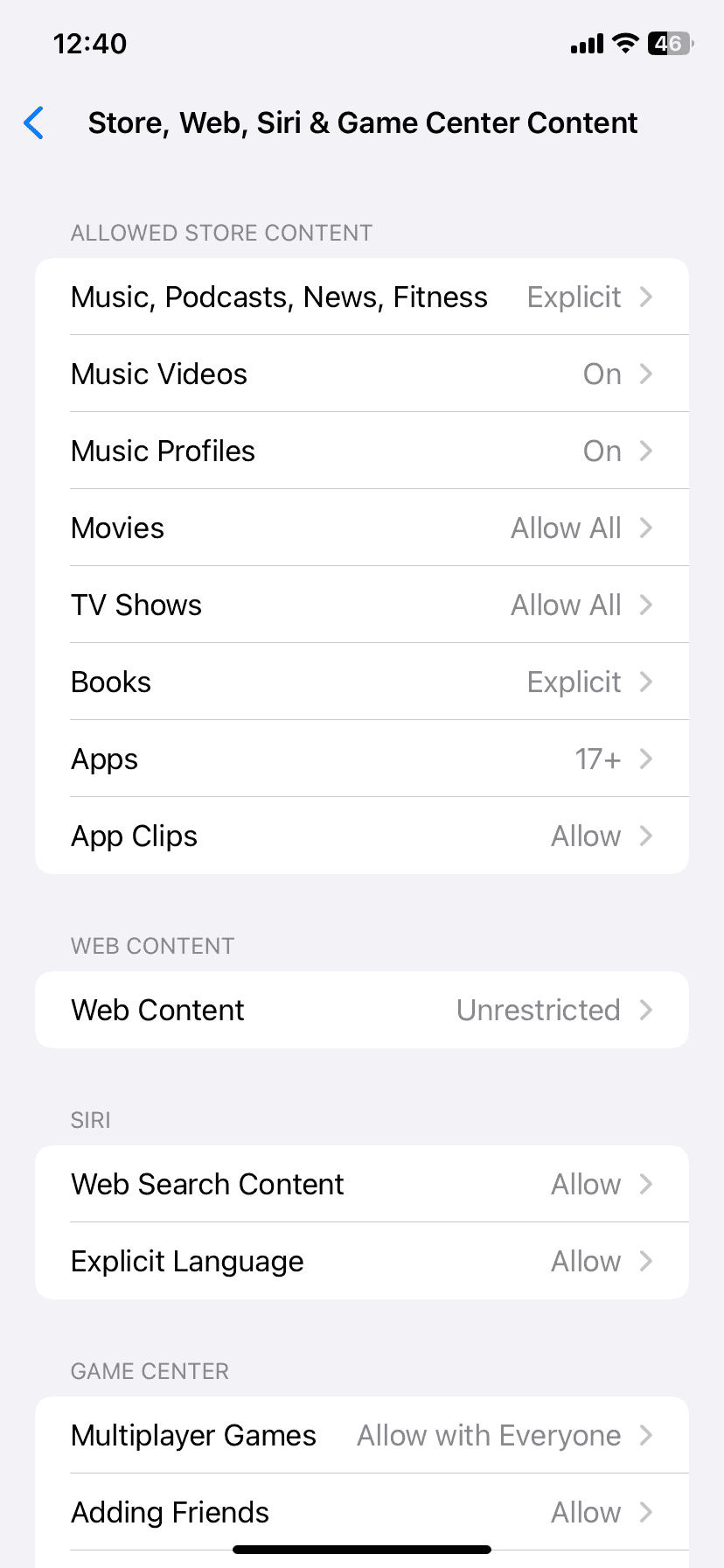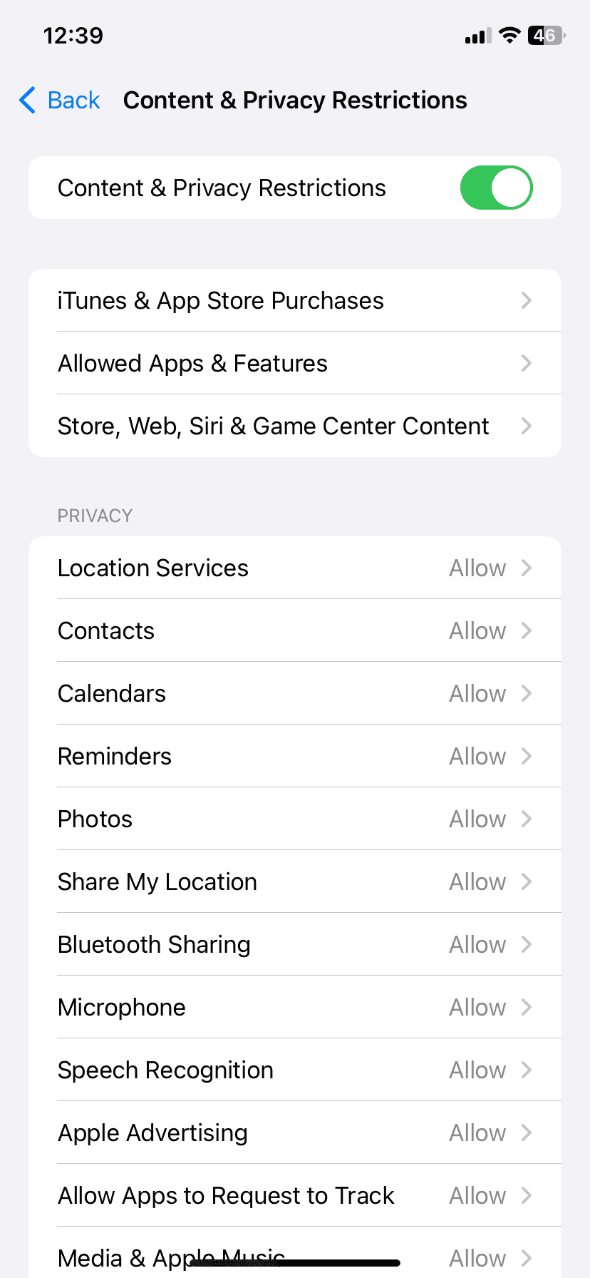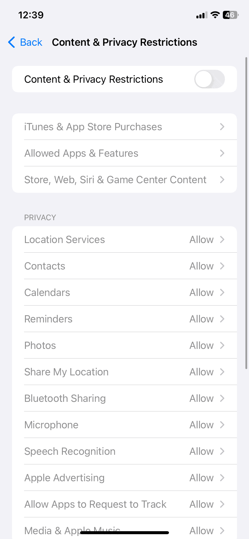 家長控制可能處於活動狀態。檢查屏幕時間設置。確保內容和隱私限制已關閉。如果您無法更改這些設置,您可能需要屏幕時間密碼。