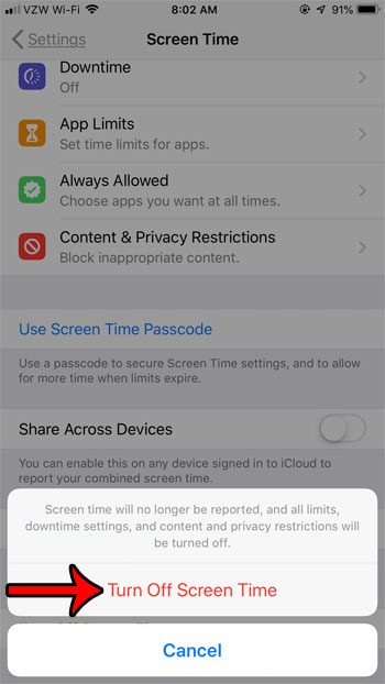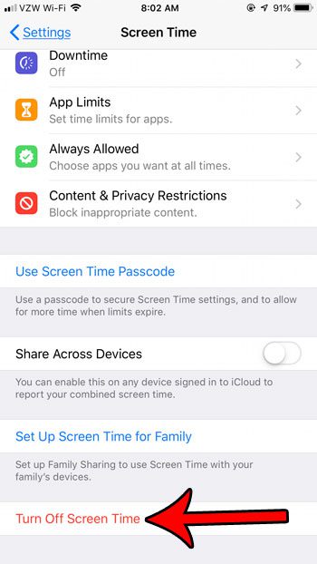 我們的指南在下面繼續提供有關如何關閉 iPhone 上的屏幕時間的更多信息,包括這些步驟的圖片。