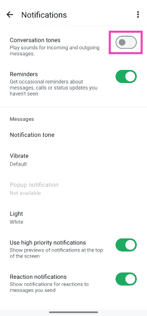 啟動 WhatsApp,點擊省略號,轉到設置>通知,然後關閉“對話音”旁邊的切換開關。