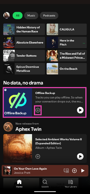 離線備份播放列表在離線後立即出現在您的Spotify主頁上。您可以通過點擊加上圖標來將其添加到庫中。