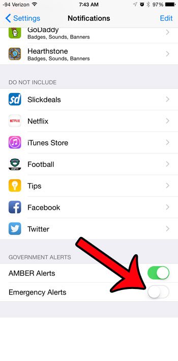 步驟 3:一直滾動到此菜單底部,然後點擊右側的按鈕緊急警報將其關閉。