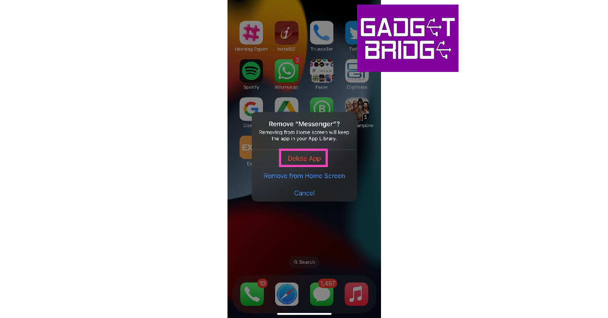 按住 iPhone 主屏幕上的 Messenger 應用程序圖標,選擇“刪除”,然後選擇“刪除應用程序”以將其從設備中刪除。