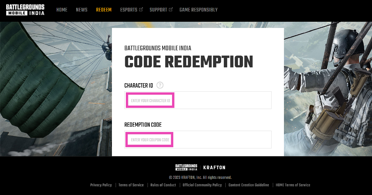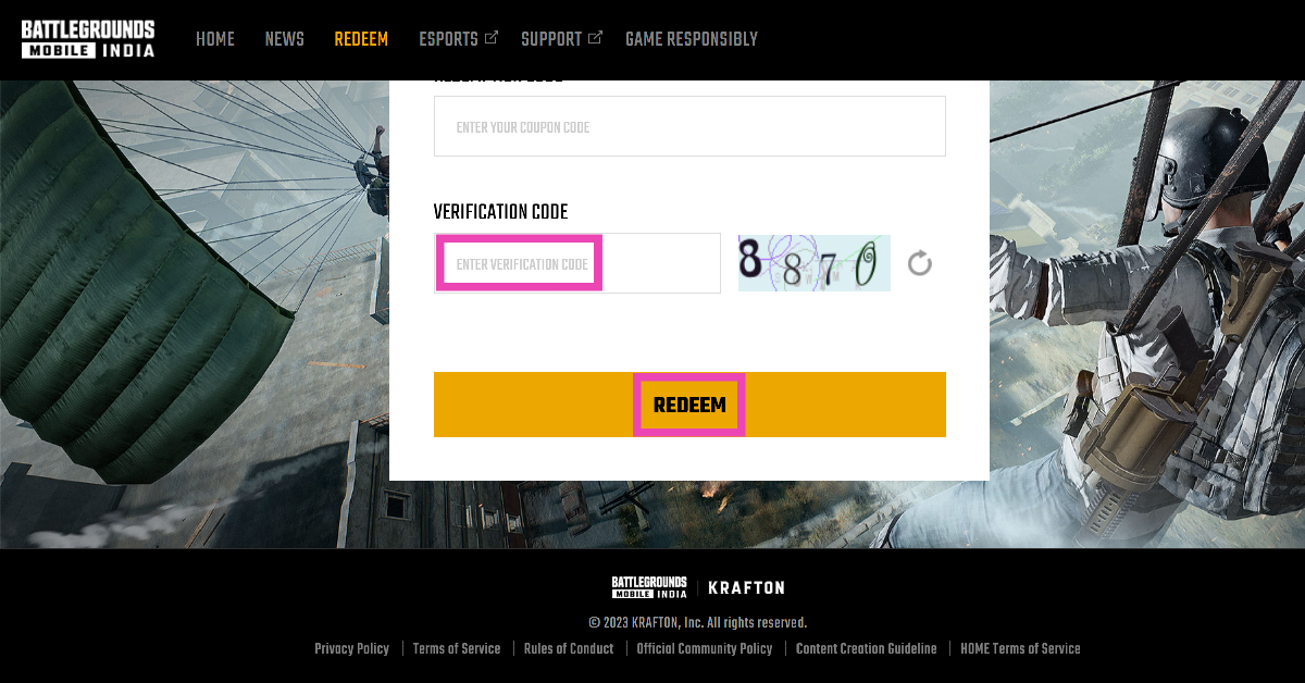 前往 BGMI 網站,點擊“兌換”,輸入您的角色 ID,然後輸入兌換碼。輸入屏幕上顯示的驗證碼並按 Enter 鍵。