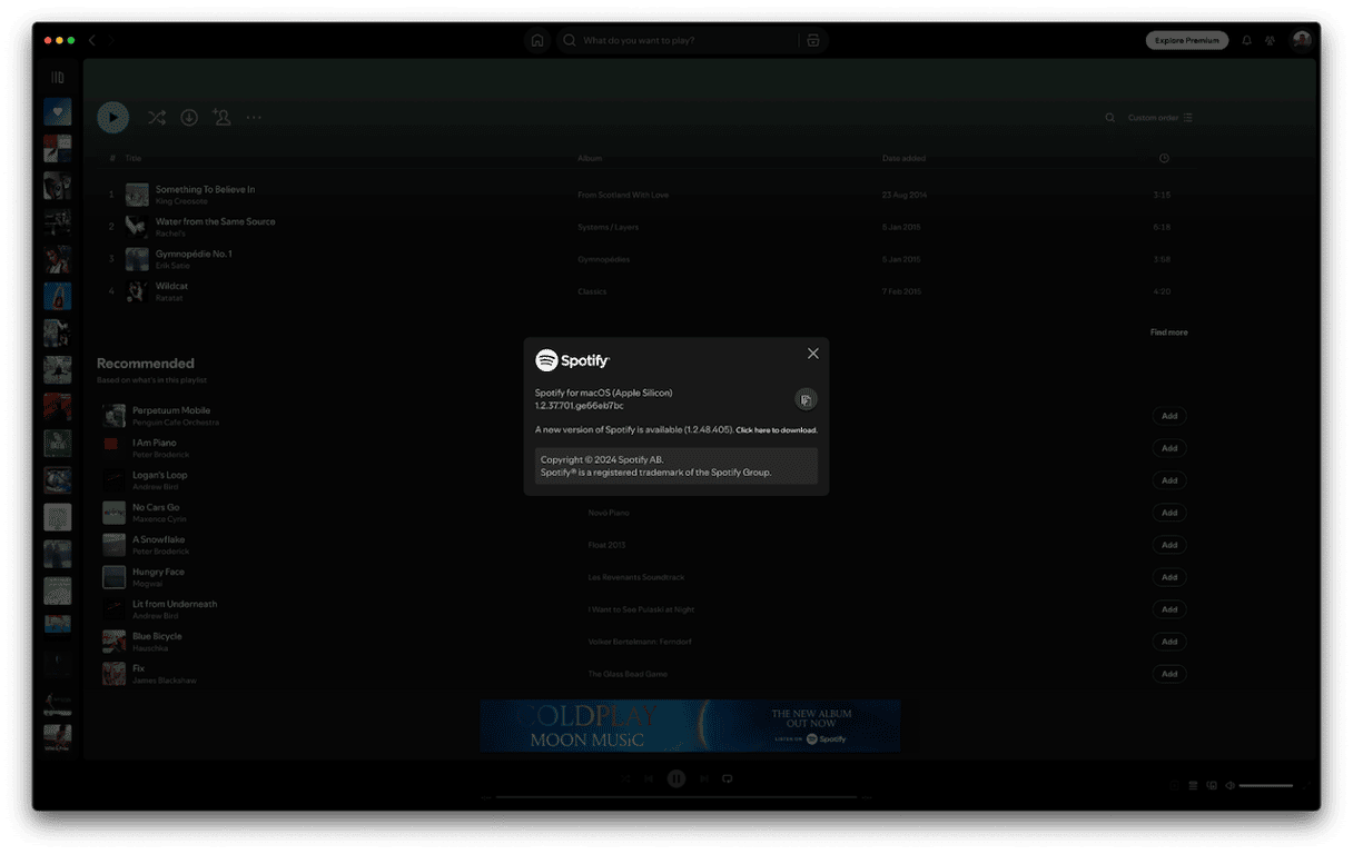 - 將打開一個窗口,如果有可用更新,您將看到“有新版本的 Spotify 可用”字樣。單擊此處下載。