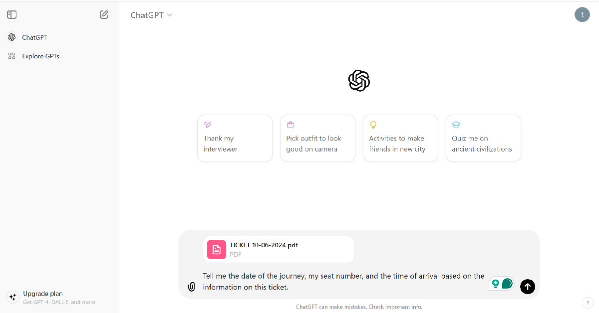 您還可以將多個 PDF 上傳到 ChatGPT,並讓聊天機器人對文件進行比較分析或瀏覽一份長期合同。聊天機器人完成這項任務的速度和準確性是驚人的。使用此功能的另一種實用方法是上傳您的門票並要求機器人提取重要信息(例如您的座位號、旅程時間等)並以簡單的方式呈現給您。