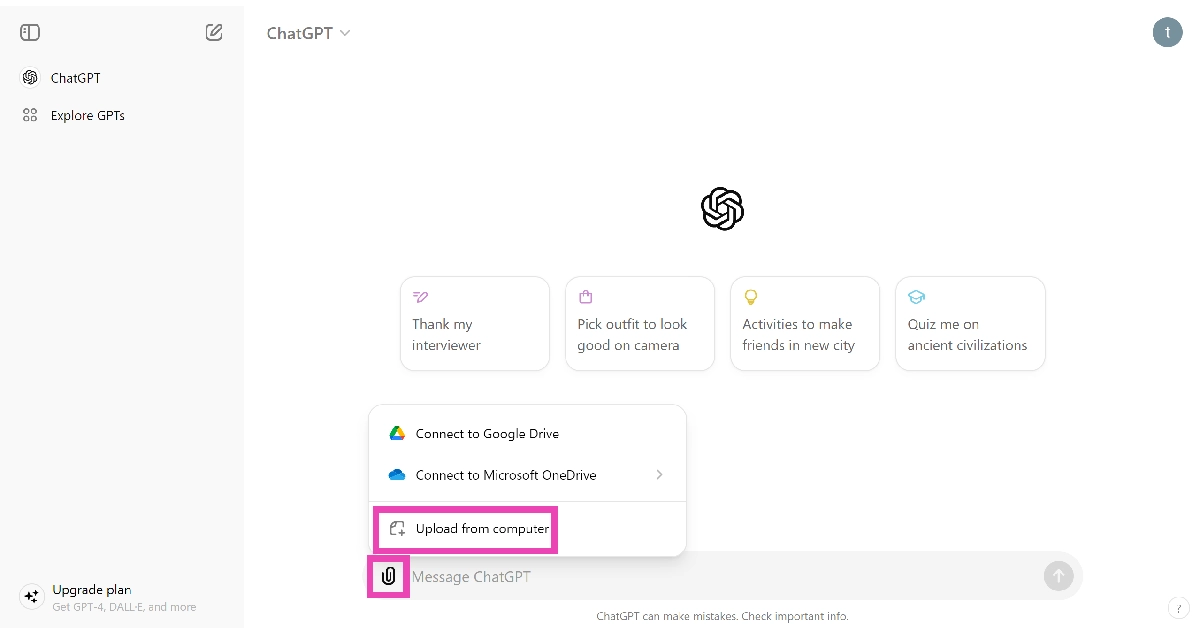 打開聊天機器人,單擊剪輯圖標,然後從 Google Drive、OneDrive 或計算機的本地存儲上傳 PDF。上傳後,您可以向 ChatGPT 詢問有關 PDF 的問題。