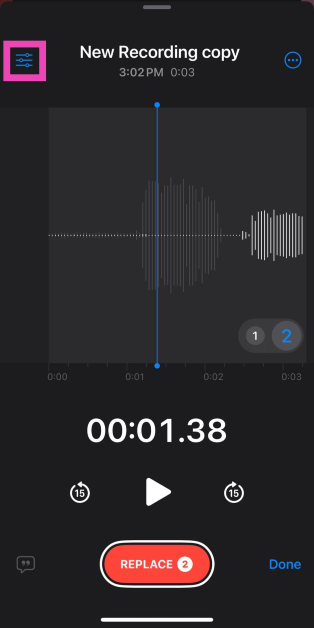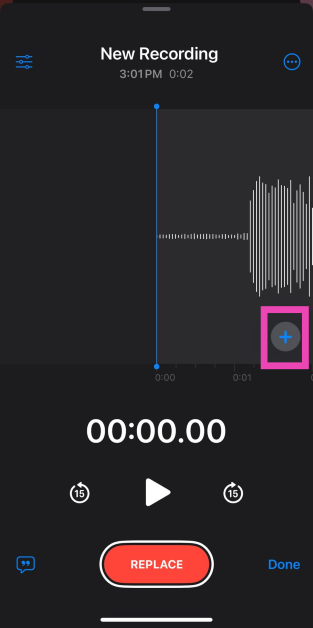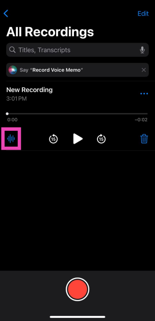 轉到“語音備忘錄”應用程序,選擇一個語音備忘錄,點擊波形圖標,然後點擊加號按鈕,然後點擊紅色按鈕錄製第二層。