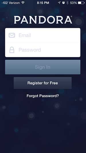 步驟 6:輸入您的 Pandora 電子郵件地址和密碼,然後點擊登入按鈕。如果您還沒有 Pandora 帳戶,那麼您可以觸摸免費註冊按鈕並創建一個新帳戶。