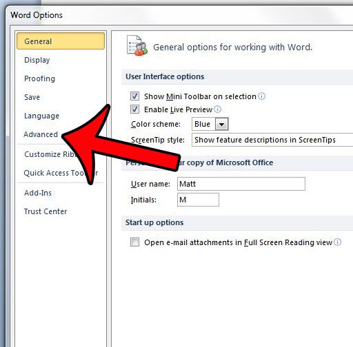 第四步:點擊先進的在左側的列中單詞選項窗戶。