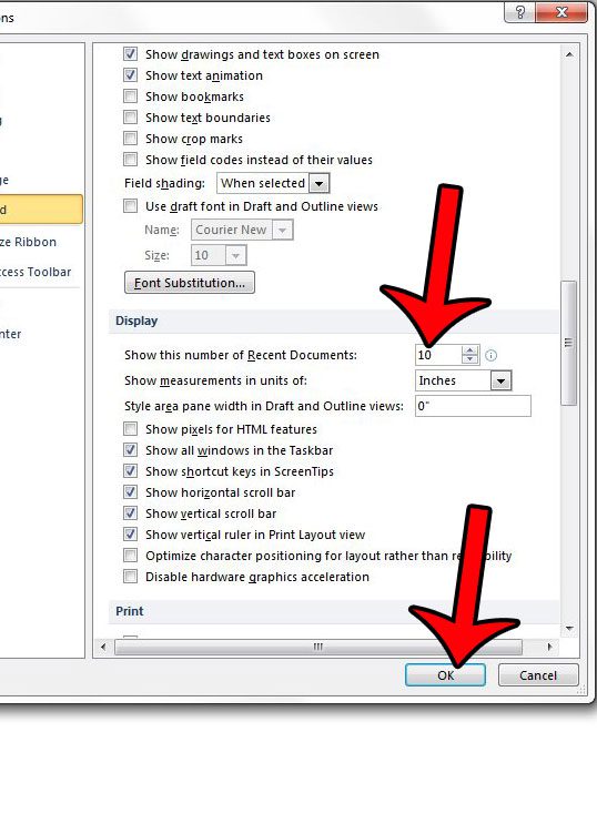 第 5 步:向下滾動,然後在右側的字段內單擊顯示最近文檔的數量。輸入您要顯示的文件數量,然後單擊好的按鈕位於窗口底部。