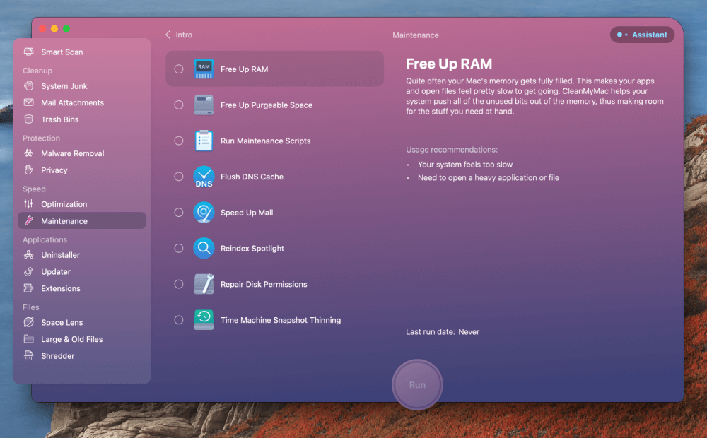 CleanMyMac X允許您釋放 RAM、運行維護腳本、刷新 DNS 緩存、加速郵件、修復磁盤權限以及執行時間機器快照精簡,所有這些都只需單擊一個按鈕即可。