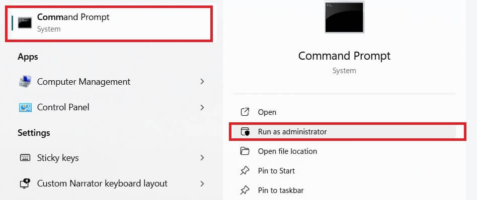 - 鍵入命令提示符並單擊以管理員身份運行。
