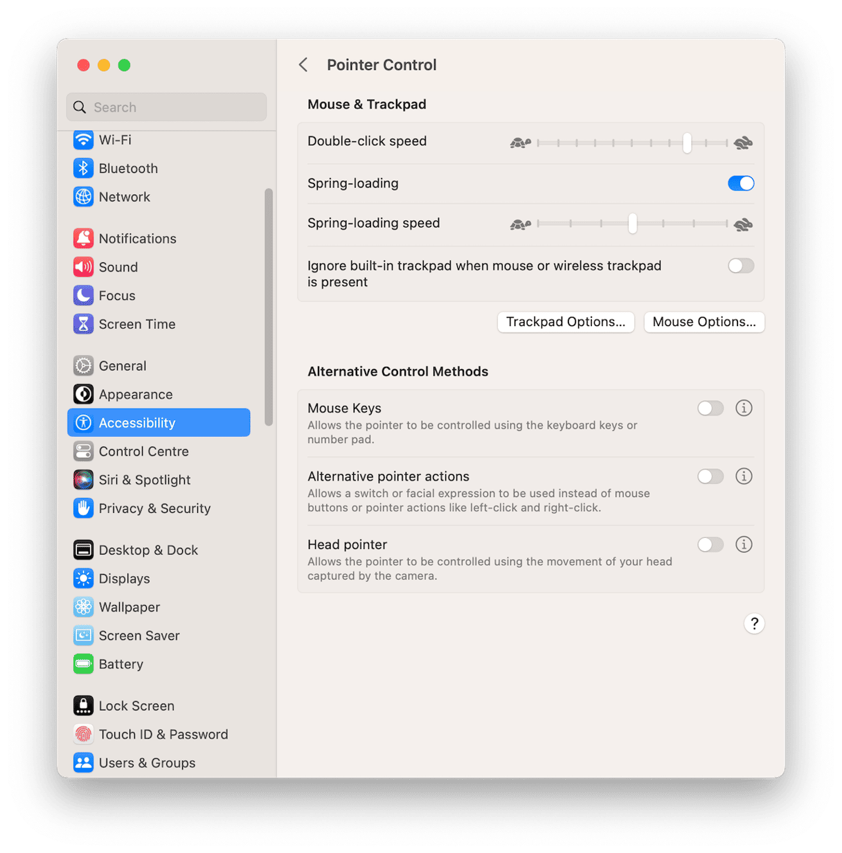 除了系統設置中的常規鼠標設置之外,還有另一組控件用於管理 Apple 鼠標上的滾動方式。這些隱藏在系統設置的“輔助功能”部分中。單擊 Apple 菜單並選擇系統設置 > 輔助功能。選擇“指針控制”,然後單擊“鼠標選項”。您將看到滾動速度的設置。如果滑塊一直向左移動,則可能是導致問題的原因。將其移向中間。