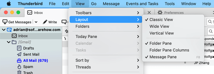 Thunderbird 也同樣容易。我輸入了我的姓名、電子郵件地址和密碼,其餘的配置就為我完成了。沒有要求我選擇佈局,但這可以通過“視圖”菜單輕鬆完成。