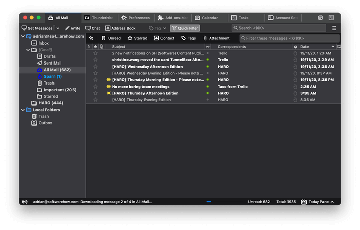 雷鳥是每個主要桌面操作系統上都可用的長期電子郵件客戶端。它非常強大而且不花錢。該應用程序提供強大的搜索功能,檢查垃圾郵件,並使您能夠創建複雜的規則來自動組織您的電子郵件。您可以利用其豐富的插件生態系統添加更多功能。