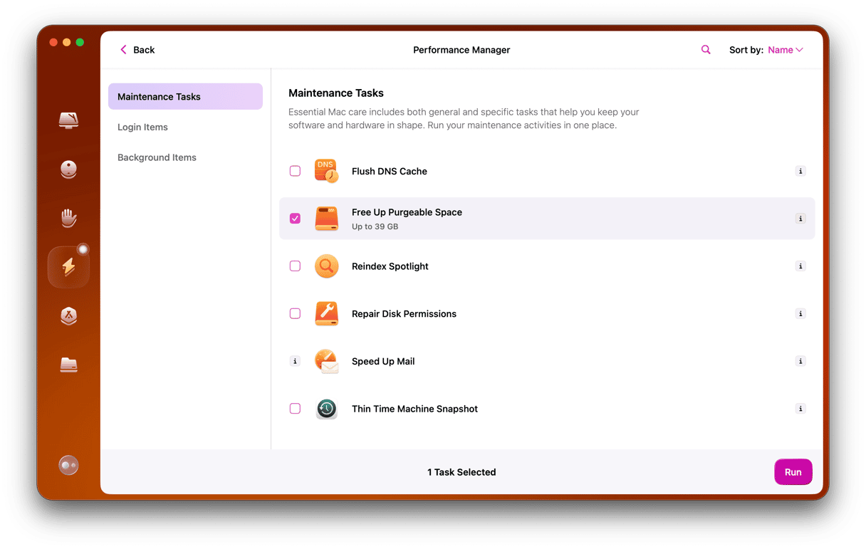 釋放可清除空間的最簡單方法是使用 CleanMyMac 中的性能功能。它可以識別該任務以及需要運行以提高性能的其他任務,例如稀疏時間機器快照,並且它允許您單擊即可運行它們。