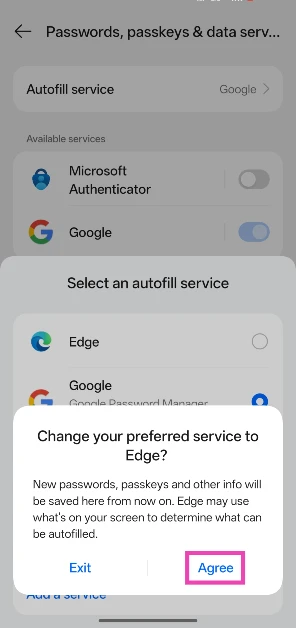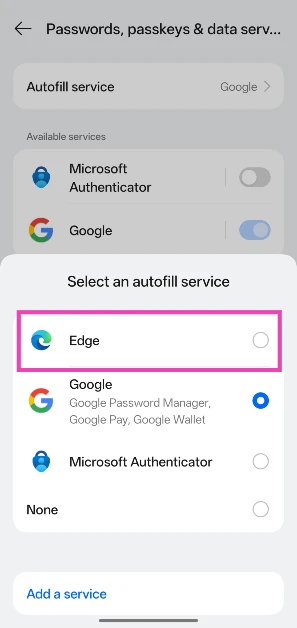 前往設置>安全和隱私>更多安全和隱私>密碼、密鑰和數據服務>自動填充服務,然後選擇邊緣。