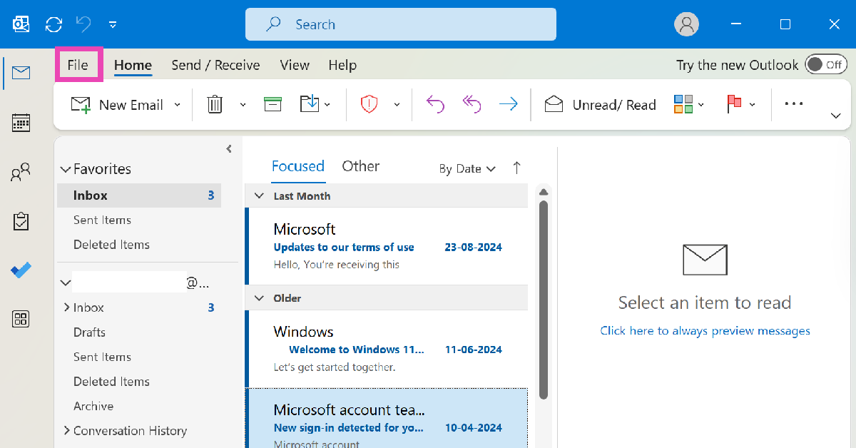 步驟一: 發射PC 上的 Outlook,然後單擊文件。