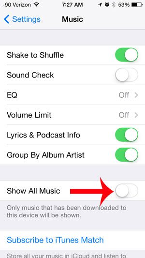 發生這種情況是因為運行 iOS 7 操作系統的 iPhone 5 有一項名為“顯示所有音樂”的功能,該功能將顯示物理存儲在設備上的歌曲以及您擁有的存儲在 iCloud 中的歌曲。