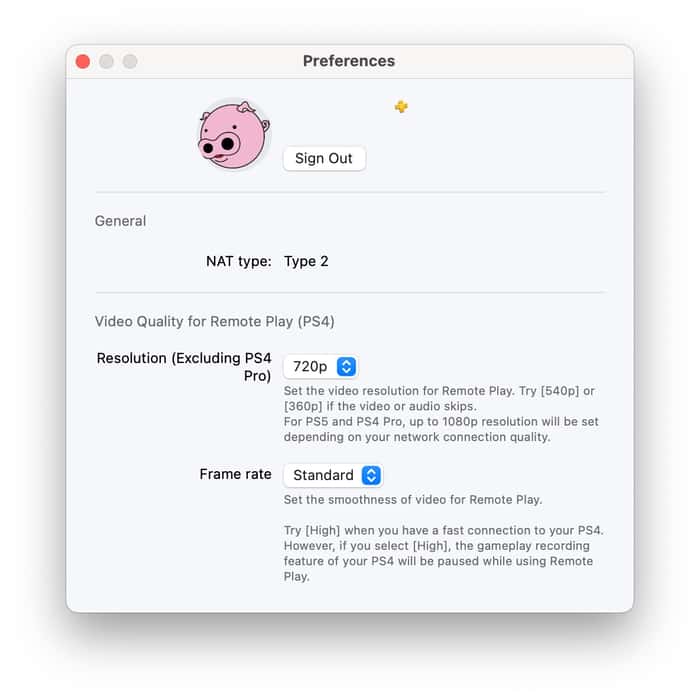 如果您在 Mac 上單擊“遠程暢玩”中的應用程序名稱並選擇“設置”,則可以更改遊戲的視頻分辨率和幀速率。如果您不斷看到“Remote Play 連接”通知,您可以通過轉至主機上的“設置”>“系統”>“Remote Play”並打開“隱藏 Remote Play 連接狀態”來阻止其出現。