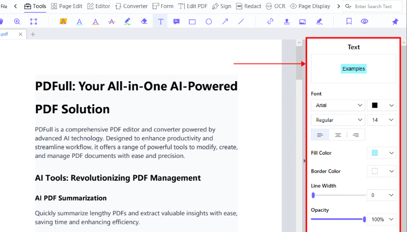 了解微調文本的必要性,PDFull 提供了一組編輯功能。只需單擊幾下即可更改文本顏色或字體大小,從而編輯 PDF 文檔中的文本。