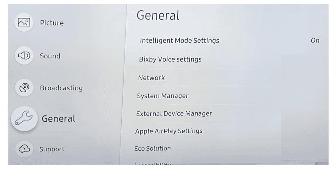 現在打開AirPlay。在三星電視遙控器上按主頁按鈕。前往“設置”。選擇常規。選擇Apple AirPlay 設置。如果尚未打開 AirPlay,請將其打開。如果您想要額外的安全性,您還可以在此處設置密碼。