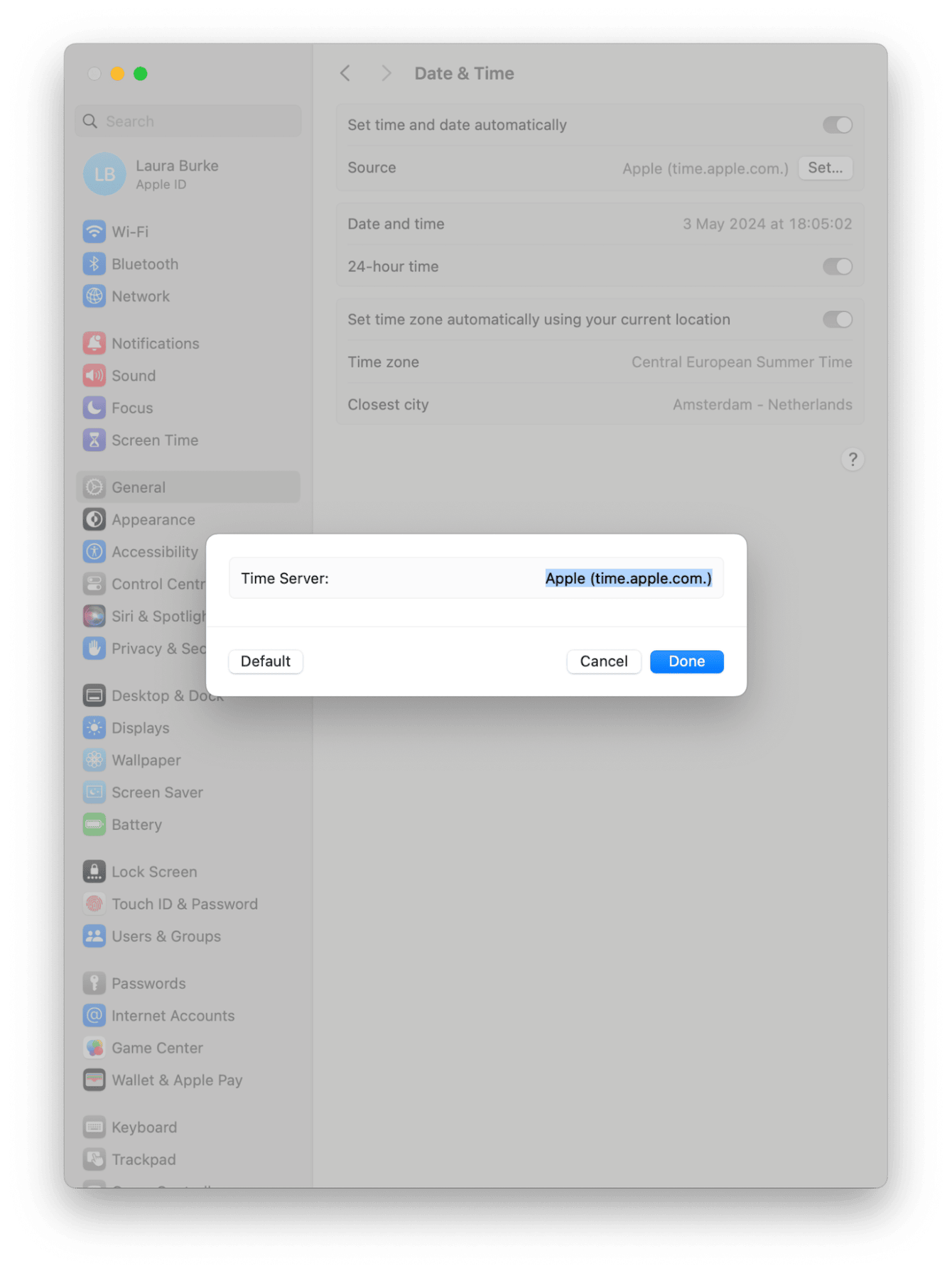 - 選擇 Apple 主菜單 > 系統設置 > 常規 > 日期和時間。