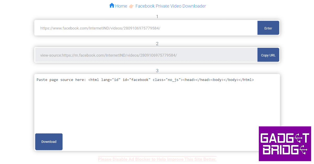 維德薩弗是另一個從 Facebook 下載私人視頻的免費在線工具。它遵循與 Facebook Private Downloader 相同的過程。複製視頻 URL 並將其粘貼到第一個窗口中。在下一個窗口中,粘貼視頻頁面源代碼。您可以通過在視頻頁面上按 Ctrl + U 來訪問它。完成後,單擊“獲取”將視頻下載到您的設備上。