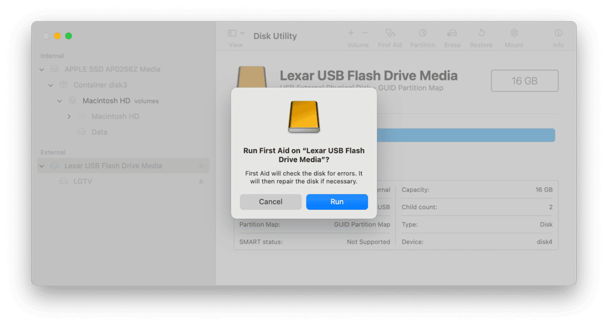 - 選擇“運行”並等待“磁盤工具”嘗試修復問題。